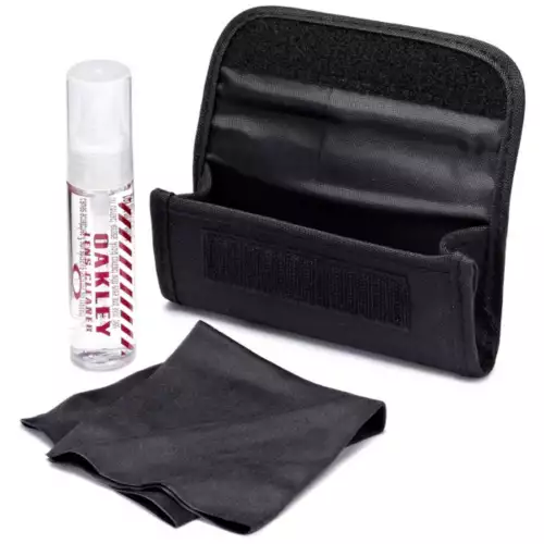 Even the best optics on earth can be compromised by dirt dust and the natural oils of your skin. Specially formulated for Oakley eyewear our cleaning solution offers the highest level of clarity without affecting the optical precision of our performance lens coatings. The pump atomizer delivers a measured dosage for each lens surface. You also get a streak-free cloth. All components fit conveniently in a durable case of ballistic nylon.